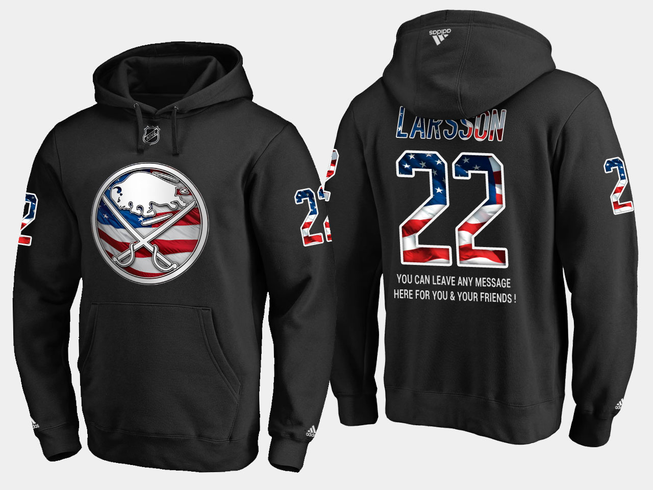Exceptional Sabres #22 Johan Larsson NHL Banner Wave Usa Flag Black Hoodie Retailers boost your inventory Order these popular Sabres jerseys